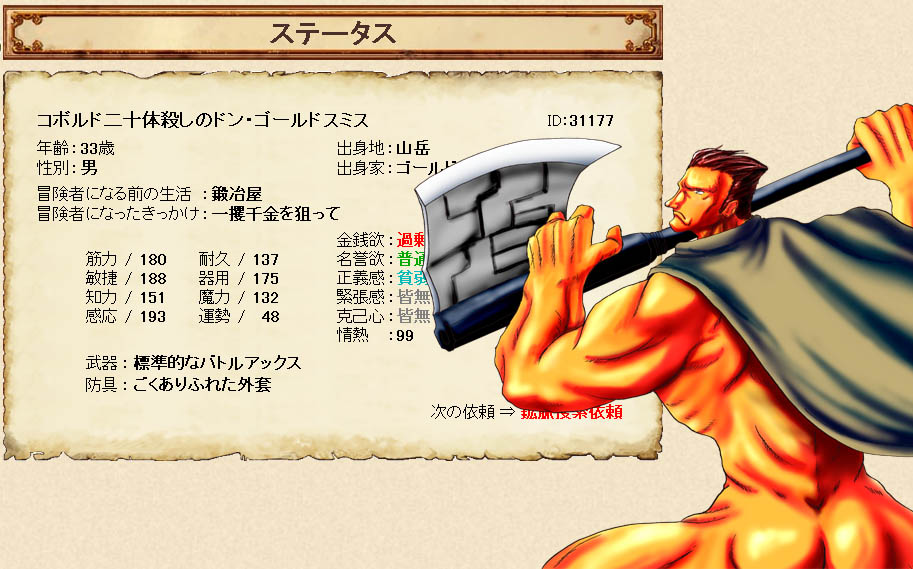 冒険者になってから丸3年を生き延びた古強者なのですが、まずいことに情熱の値がレッドゾーンぎりぎりまできており、次の冒険でまた情熱が減ったら引退確実です(´д`)
